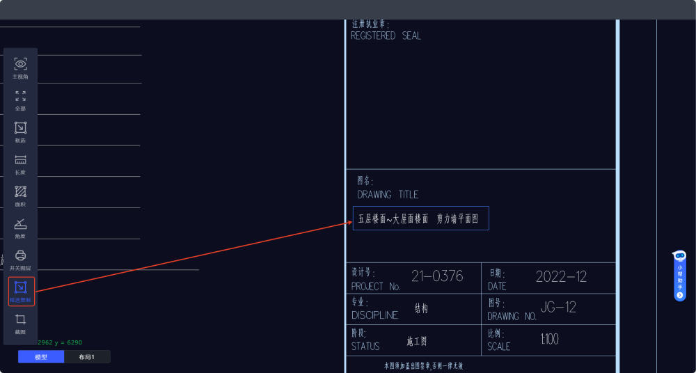 ## 信息校对 ① 子项、图名必须正确填写(信息错误将影响审查结果),单击单元格文字可补充缺失或修改错误的子项、图名(缺失信息标红显示在未审查图框列表)。  ② **【原图】** 功能支持快速查看图纸信息。  ③ **【框选复制】** 功能可将图纸内文字信息复制到剪切板,方便快速修改子项,图名信息。