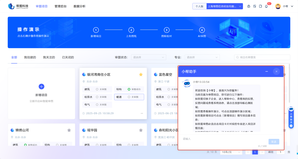 小帮助手可供用户查看当前页面的操作指引,用于快速完成指定操作,进入不同页面,如产生操作问题,查点击 **【小帮助手】** 进行查看,如有问题可向小帮助手咨询。