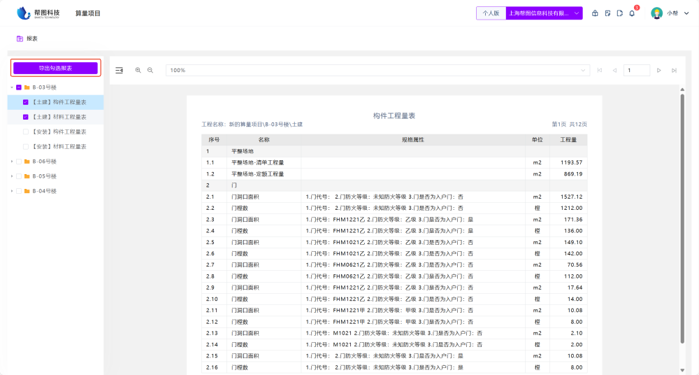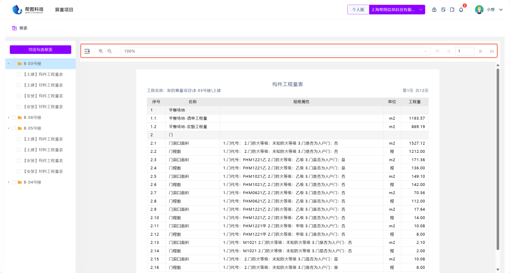 ① 点击 **【查看报表】** 查看AI算量结果。  ② 算量结果按子项与专业划分,点击子项\-专业名可查看对应算量结果。  ③ 点击 **【导出勾选报表】** 可导出已勾选的算量报表。  ④顶部区域支持收起左侧列表,调整算量报表缩放比例与翻页。